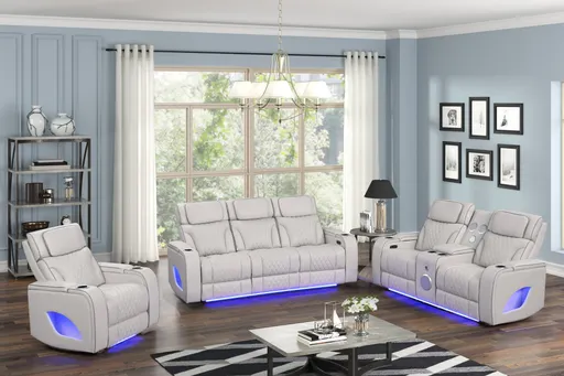 Bring home a true modern theater-style experience with the Ice Grey 3-piece power reclining living room set—designed for movie nights, game day, and everyday relaxation. Wrapped in a smooth Ice Grey leather-look upholstery with Grey contrast piping, each piece features diamond-quilted stitching for a clean, upscale look that feels right at home in contemporary spaces.