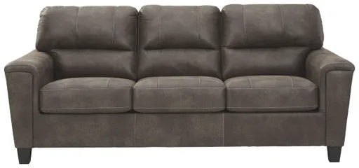If you love the cool look of leather but long for the warm feel of fabric, you can take comfort in this queen sofa sleeper. Wrapped in a fabulous faux leather with a weathered hue and hint of pebbly texture to resemble the real deal, this decidedly modern sofa proves less is more. Elements include angled side profiling and track armrests wrapped with a layer of pillowy softness for that little something extra. Prominent jumbo stitching and clean-lined divided back styling lend fashion-forward flair. Rest assured, the queen memory foam mattress comfortably accommodates overnight guests.