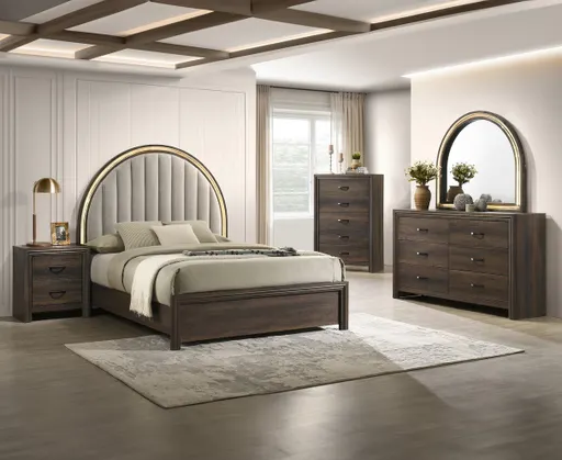 Transform your bedroom into a serene oasis with this elegantly designed suite that combines modern innovation with timeless style. Featuring integrated lighting on the headboard and mirror, this ensemble creates a warm, inviting ambiance perfect for relaxation. The sleek lines and rich finishes add a touch of sophistication, while the ample storage options ensure seamless organization. Each piece is crafted with precision to enhance the overall aesthetic, making it a harmonious addition to any space. Experience the perfect blend of luxury and functionality with this exceptional bedroom collection.. Integrated LED touch light Channel tufted Arched shape