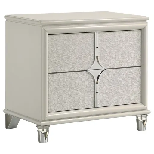 Elevate your nighttime routine with this stylish 2-drawer nightstand, a perfect blend of form and function. The pearl white finish and diamond star design on the drawer front offer a touch of glamour, while the chrome metal pulls add a sleek contrast. Featuring a top drawer with cord management access, this nightstand is designed to keep your devices neatly organized. The acrylic legs and chrome tulip-shaped caps provide a unique and elegant touch. Experience convenience and style right by your bedside.