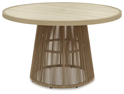 Whether it's decking out your deck or making a splash by the pool, this outdoor dining table is all about easy-breezy outdoor living. Its base features a nicely neutral rope wrap over a sturdy, rust-resistant aluminum frame that’s sure to weather the seasons beautifully. A sintered stone top enhances the table’s beauty and robustness.