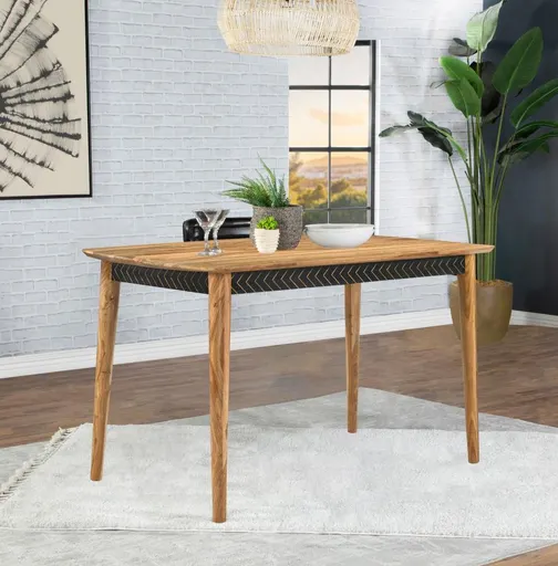 A perfect addition to contemporary homes, this mid-century style counter height table creates a warmth to a dining area with its solid natural Sheesha wood frame. Graceful curved edges and a 45-degree chamfered profile lend a softness and elegance to this furniture piece. Along the apron of this charming contemporary dining piece is an arrow-inspired graphical design in a contrasting black hue that lends a playful touch. Supported by long slender legs that taper toward the feet, this counter height table pushes the vintage vibes. Pull up a counter height stool or chair to seat six family members or guests comfortably.