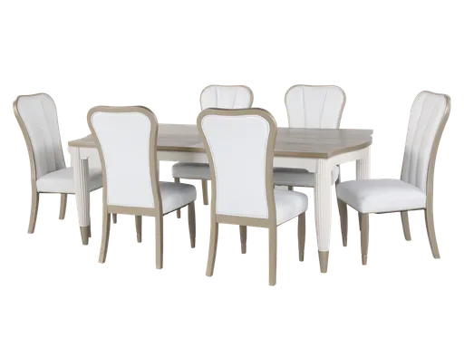 Bring a bright, upscale look to your dining space with this Pearl White Champagne dining set—a clean, glamorous design that feels both classic and modern. The rectangular table features a light-toned top with elegant edge detailing, paired with tapered, fluted legs and warm champagne accents for a polished finish. The matching side chairs complete the look with a tall, curved silhouette and soft white fabric upholstery, giving you a comfortable seat for weeknight dinners and special occasions alike.
