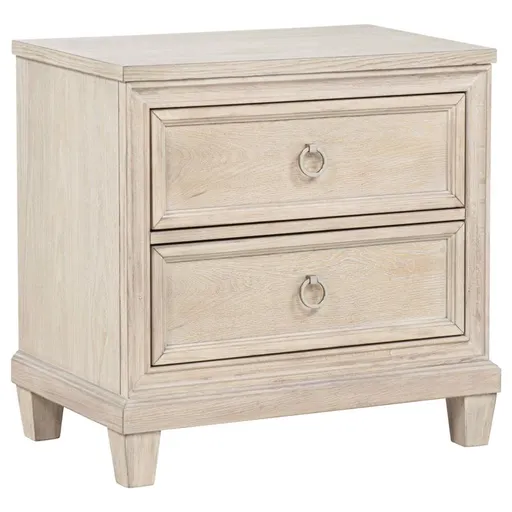 Effortlessly elegant and thoughtfully designed, this two-drawer nightstand brings refined charm to the bedside. Framed with stepped trim and finished in breezy washed oak, it offers a light, coastal-inspired presence. Polished nickel ring pulls add a glint of elegance, while built-in cable access discreetly manages devices tucked inside the upper drawer. Crafted from poplar, oak veneer, and engineered wood, it marries timeless style with everyday convenience.