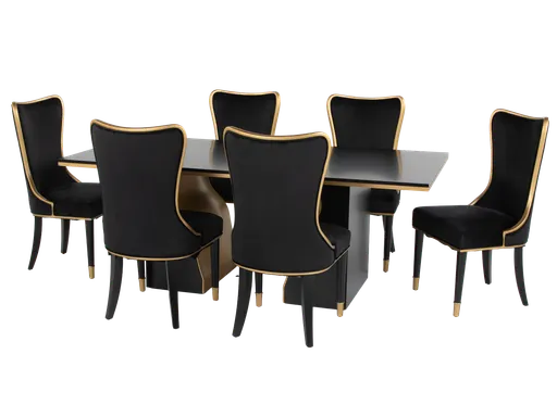 Transform your dining area with this striking modern black and gold dining set. The set features a sleek black rectangular dining table with bold gold accents, paired with six elegant black velvet chairs trimmed in gold. Each chair offers plush comfort and a sophisticated silhouette, making every meal a luxurious experience. Built with quality materials and a dramatic color palette, this set is ideal for upscale dining rooms and stylish homes.