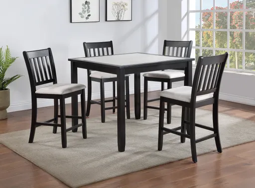 Introducing a modern counter-height dining set with a touch of classic charm. Featuring a deep black finish, complemented by a contrasting light table top inset, this ensemble offers both comfort and straightforward style. The vertical slats on the chairs provide a subtle design detail, making it a versatile choice for various dining spaces. Durable, stylish, and functional, it's the perfect addition for everyday meals or special occasions..2 toned table veneer inlay Slat back chairs Solid wood legs