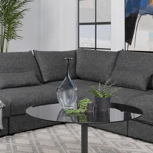 Anchor your modular sectional with this plush corner chair, designed to create a seamless transition between seating pieces. Upholstered in barely black fabric, this chair brings a bold yet versatile touch to your modern living space. The corner design maximizes seating capacity while maintaining a cohesive look, and its foam and feather filling ensure exceptional comfort. Built with a sturdy pine wood and plywood frame, this chair is made to last, offering a perfect blend of style and durability. The removable back and seat cushions add convenience, making it easy to maintain and rearrange your sectional setup.Includes: One (1) corner chair• Corner chair for modular sectional configuration • Upholstered in barely black fabric for a bold, versatile look • Foam and feather filling provides plush comfort • Sturdy pine wood and plywood frame ensures durability • Removable back and seat cushions for easy maintenance and flexibilityDimensions:Corner Chair: 36.5" x 36.5" x 35.0", SeatHeight: 18.0, SeatWidth: 23.0, SeatDepth: 24.25, Weight: 53.68
