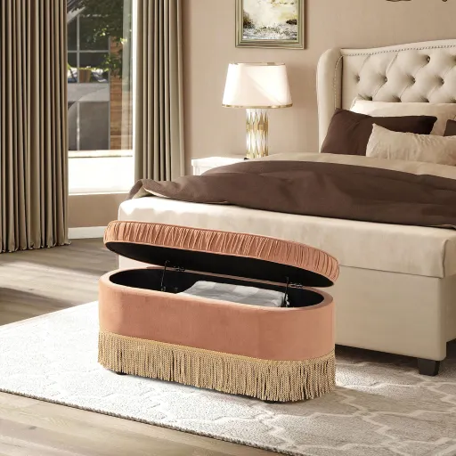 Elegant Dual Functionality: This storage bench seamlessly transitions between an elegant storage solution and a stylish seating option, making it an ideal addition to any room in your home. Spacious Storage: Lift the flip-top seat to reveal a spacious compartment perfect for organizing blankets, pillows, shoes, and more, helping to keep your space neat and clutter-free. Classic Glamour Detail: The bench features ruched fabric around the seat rim and bullion tassel fringe along the bottom, adding a touch of classic glamour to your interior décor. Contemporary Design: Its oval/pill-shaped silhouette provides a modern twist, ensuring it complements a wide range of interior styles, from traditional to contemporary. Practical and Aesthetic: Offers additional seating and hidden storage, making it a practical yet aesthetically pleasing addition to living rooms, bedrooms, or entryways.