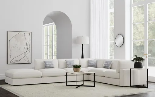 Covered in a linen-like fabric all around, this super comfy sectional offers all the seating you need in an open concept living room or entertainment area. Designed with two armless chairs, two corner chairs and a single oversized ottoman, this contemporary modular sectional offers reversible back pillows and jacquard accent pillows that you can really sink into. Black feet peer from beneath, offering a slight elevation for rugs and other flooring. With an L-shape design, this sectional works in a variety of room dimensions. A spacious ottoman also doubles as a coffee table, keeping a tray of refreshments and snacks when hosting guests.