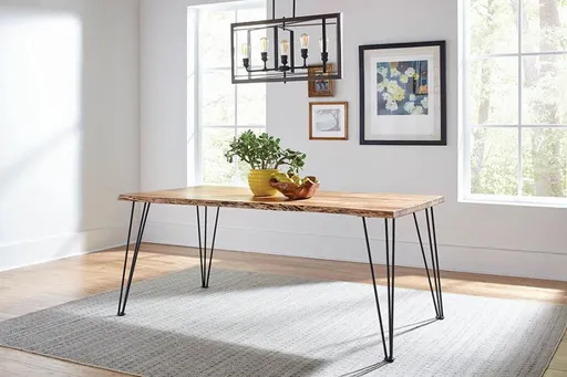 An interesting take on industrial modern design, this rectangular dining table is full of bold visuals. Constructed of wood, the table top showcases a distressed natural acacia finish that reveals the wood grain. Dark hues are exposed along the sides of the rustic top, matching the deep gunmetal finish of the legs. Sleek and contemporary, an open hairpin leg design is made with thin lines of metal. Elevated and open, this charming table adds a cozy feel while maintaining a clean and up-to-date feel.Sherman - Table Top, Box 1 of 2 - Natural Acacia
