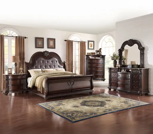 Step into a world where classic elegance meets timeless design with our exquisite bedroom collection. Designed for those who covet regal charm and functionality, this suite features rich, deep wood tones that evoke the grandeur of an aristocratic estate. Each piece boasts intricate carvings and moldings, with a stately bed that stands as the centerpiece — its leatherette tufted headboard provides a touch of luxury and comfort. The coordinating pieces, including a multi-drawer dresser, a gracefully curved mirror, and a tall chest, all offer generous storage while maintaining the sophisticated aesthetic. Marble tops and antiqued hardware add a final touch of elegance, ensuring this collection will elevate your bedroom into a luxurious retreat..Genuine marble top Bow front Dimensions: Depth: 19.5 (inch), Height: 32.5 (inch), Width: 45 (inch), Weight: 107.8 (lb)