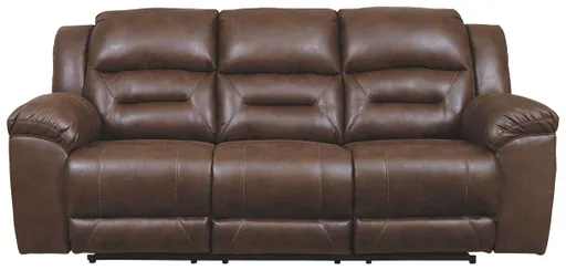 For those that love the cool look of leather but long for the warm feel of fabric, this power reclining sofa delivers both with ease. Its high-performance padded faux leather is remarkably durable and easy to clean, just the thing for family spaces. When it's time to relax, the one-touch power control puts the perfect position at your fingertips. Channel-stitched back cushions provide indulgent lumbar support for maximum seating comfort'not to mention fashion-forward flair.