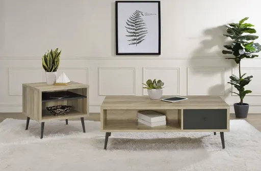 This coffee table set combines retro-inspired elements with modern practicality for a timeless living room update. The coffee table features a sleek rectangular silhouette, complete with a deep drawer front and open compartment for storing periodicals and books. The end table, with its square shape, offers a deep gray interior shelf to organize both tall and small items. Both tables are constructed from distressed finish engineered wood and rubberwood, with tapered rounded legs for a nod to retro style.