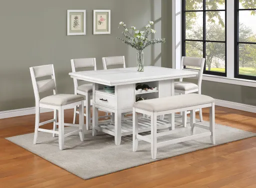 Bring a fresh look to your dining space with this breezy counter height group. The table has an array of design features, including drawers, bottle storage, and an open bottom shelf. Ladderback chairs and bench are upholstered in a Chevron pattern fabric with piping detail. .Upholstered seat Solid wood legs Stretcher supports