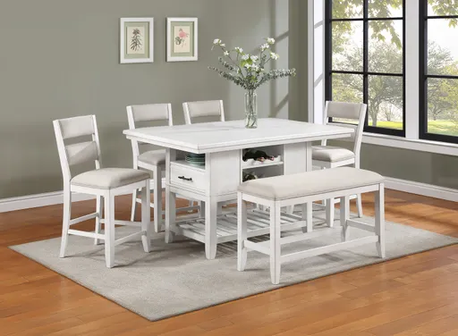 Bring a fresh look to your dining space with this breezy counter height group. The table has an array of design features, including drawers, bottle storage, and an open bottom shelf. Ladderback chairs and bench are upholstered in a Chevron pattern fabric with piping detail. .Open slat shelf 2 side drawers bottle racks Faux plank top