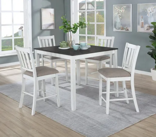 Bring easy, everyday style to your dining nook with this space-savvy counter set. A 42" square table sits at a 36" counter height with clean, tapered legs, paired with four slat-back stools cushioned in a durable, family-friendly fabric. A two-tone white/gray finish keeps the look fresh and versatile—from breakfast corners to open-concept kitchens.