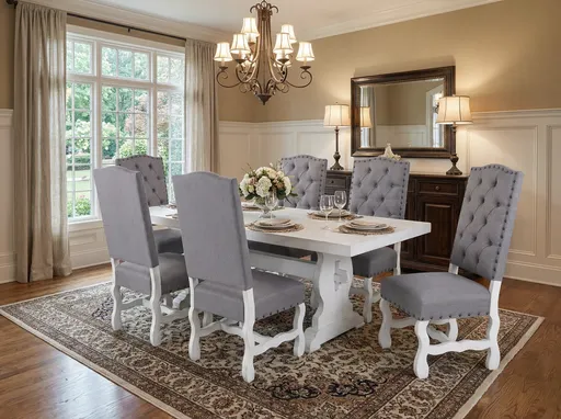 This elegant dining table set features a rectangular white table with a sturdy base and six matching chairs. The chairs are upholstered in a sophisticated grey fabric with a tufted backrest design, adding a touch of classic charm. Each chair has a high back and cushioned seat for comfort, supported by intricately carved white wooden legs that match the table's base. The combination of white wood and grey upholstery creates a timeless and versatile look, perfect for both modern and traditional dining spaces. This set is ideal for family gatherings, dinner parties, or everyday meals, offering both style and functionality.