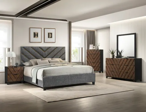 This bedroom collection captivates with its modern elegance and striking geometric patterns. Crafted from rich wood tones and plush upholstery, it offers a perfect blend of style and comfort. The bed features a uniquely tufted headboard that commands attention, complemented by matching nightstands and dressers with sleek hardware for ample storage. The set’s distinctive design elements, including the dramatic chevron pattern, add visual interest and sophistication to your space. With its contemporary aesthetic and functional features, this ensemble transforms your bedroom into a refined sanctuary of style and luxury..Dovetail drawer construction Center metal drawer guides Chevron pattern Dimensions: Depth: (inch), Height: (inch), Width: (inch), Weight: 43.23 (lb)