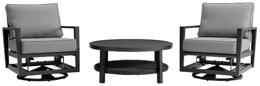 The Grand 3 Piece Black Aluminum Outdoor Swivel Seating Set with Dark Gray Cushions is the ideal addition to any outdoor space. Complete with 2 Grand swivel chairs and the round conversation table, this 3-piece set is constructed from the highest quality materials and will provide enjoyment and comfort for many years to come.
