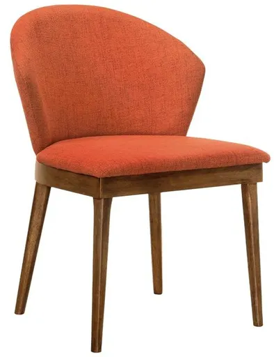 The Juno Orange Fabric and Walnut Wood Dining Side Chairs from Armen Living are a superb seating option featuring smooth and sleek craftsmanship. The tall, rounded seat back features ergonomic properties to keep your back healthy and properly aligned.
