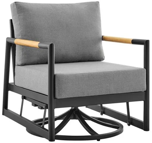 The Royal Outdoor Patio Swivel Glider Lounge Chair in Black Aluminum and Teak Wood with Cushions combines comfort and convenience. This outdoor gliding chair features durable and lightweight aluminum frame complete with warm teak accents on the arms.