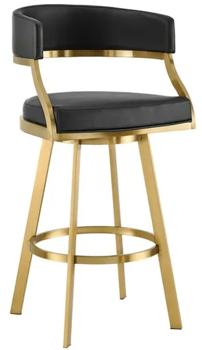 The Armen Living Saturn Black/Gold Bar Stool offers a sleek and modern look with its black seat and gold accents. It features a sturdy frame and comfortable seat, ideal for both residential and commercial spaces. Perfect for elevating any bar or kitchen setting.