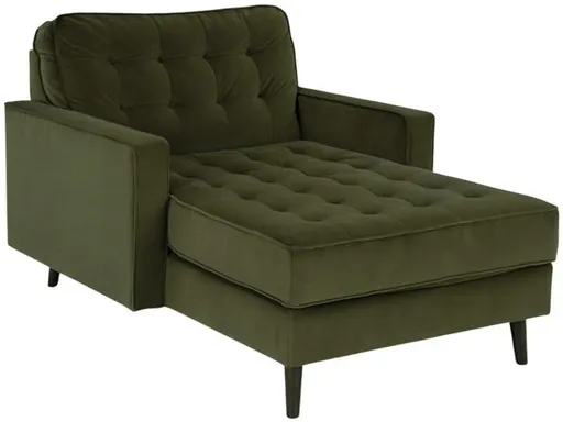 This chaise strikes the perfect balance between elevated and eclectic. Contemporary lines and a richly hued velvet upholstery keep things chic. Design details like button tufting and splay legs add mod flair. It’s sure to keep your living room luxuriously on trend—at a price that won’t break the bank.
