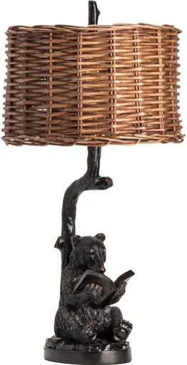The Crestview Collection Bear Knowledge Table Lamp is dark brown, with bronze highlights and boasts a resin bear leaning against a tree adsorbed in reading a book. A tan, wicker lamp shade adds to the charm of this lamp. With the lamp shade the total height of this lamp so 33.25-inches.