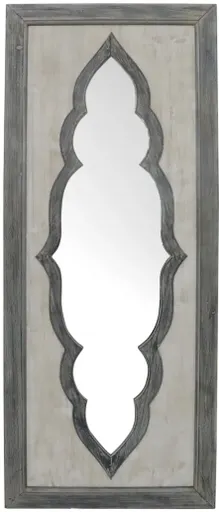 The Crestview Collection Contouring Mirror is light grey wood with dark grey framing around the border of both the rectangular piece and the center mirror. The mirror is shaped in a scalloped, middle-eastern motif bringing both transitional and rustic style to your decor.