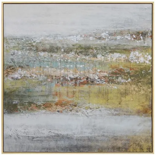 The Crestview Collection Genesis framed painting on stretched canvas offers a multitude of hues from brown, green, white, and orange. Measuring at 60-inches square, this peaceful and modern work of art offers a calming approach to art that will compliment the decor in your home.