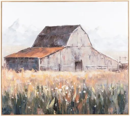 The Crestview Collection Montana Skies Painting on Canvas takes you across the field to a large barn made to house the animals in the winter to keep them warn from the cold Montana weather and to store the food they will need to survive.