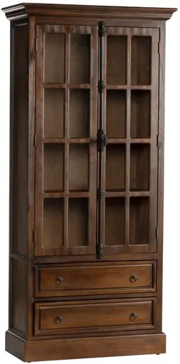 The Crestview Collection Hawthorne Estate 2-drawer 2-glass Door Curio Cabinet combines function and design into a single piece of furniture. The curio features a medium-brown and black finish, two drawers, and four shelves behind two glass doors.