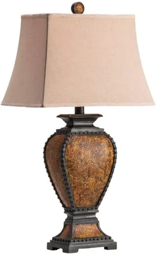 The look of natural leather with riveted edges makes the Crestview Collection Tooled Leather Table Lamp feel both modern and richly elegant at once. Bring this deep brown beauty into your home, with swirling detail on the cast resin sides finished to look like leather.