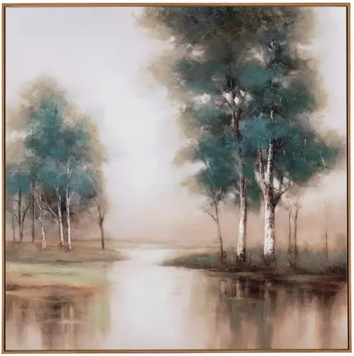 Brighten your home with The Crestview Collection Turquoise Creek Painting on Canvas. Exhibiting warm brown tones, with dark turquoise shades., this elegant landscape artwork features trees by the lake. Measuring 40-inches square, this traditional style painting is embraced by a brown gallery frame, so your home will feel the warmth this distinguished painting eminates.