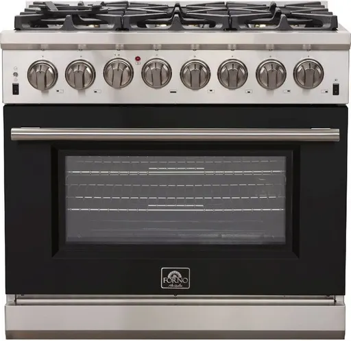 The Forno Capriasca 36-Inch dual fuel range elevates your home kitchen with its durable 304 grade stainless steel design. Featuring 6 sealed dual-ring brass burners with a total output of 120,000 BTU. The 20K dual-ring burner is perfect for boiling or searing and can also handle tasks like melting chocolate or simmering sauces. Continuous heavy-duty cast-iron grates allow for easy sliding of pots or pans off heat when desired. The 5.36 cu.ft. true convection fan oven boasts a blue enamel interior for easy cleaning and a 3-layer glass oven door window for heat retention and a clear view. With a total output of 6,300 Watts, this oven provides ample power for baking, roasting, and broiling. Included are 3 fully telescopic easy-access stainless steel oven racks, concave wok ring, a LP conversion kit. Additionally, zinc-coated metal knobs with bezel rings ensure lasting beauty.