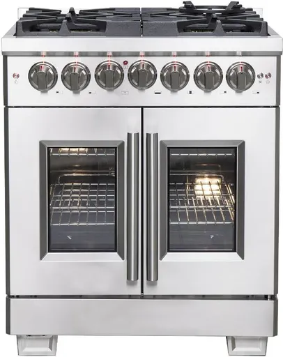 The Forno Capriasca 30-Inch french door dual fuel range harmonizes professional styling and performance into your home kitchen with its durable stainless-steel design. Unique french doors mean open doors allow up to 12 Inch of more space to access your oven. The gas range-top has 5 sealed dual-ring brass burners with a total output of 100,000 BTU for simmering melting chocolate or simmering sauces, 20K dual-ring burner for boiling or searing and is able to perform simmering like melting chocolate or sauces. The heavy-duty continuous cast iron grates allow maximum stability of cookware and mobility over a recessed enamel Cooking Surface cavity which keeps spills and splashes contained and easy to clean. The 4.32 cu. ft. electric oven with a total output of 6,300 Watts is encased in a speckled blue enamel interior fitted with a true convection fan, ensures to achieve fast, precision and consistent oven cooking along for easy viewing is a 3-layer glass oven door window. Included is an LP conversion kit, 3 stainless steel telescopic oven racks, wok-ring, reversible griddle, rotisserie kit and skewers forks, air fry basket with rack and drip pan. Additionally, zinc coated metal knobs with bezel rings will maintain their beauty for years.