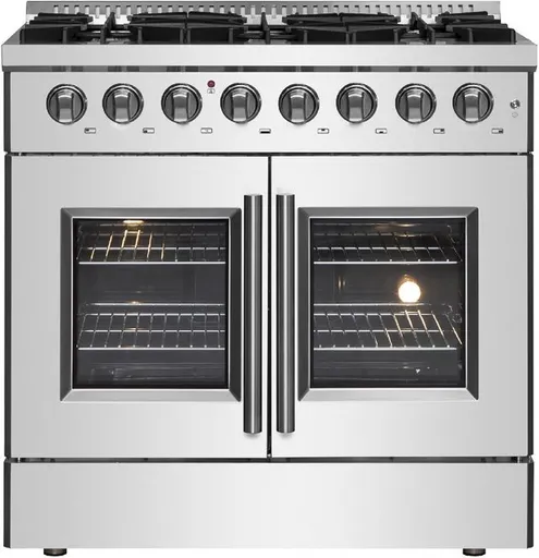 The 36 Inch Galiano Dual Fuel French Door Range brings professional styling and Performance into your home kitchen with its durable stainless-steel design. Unique french doors mean open doors allow up to 12 Inch of more space to access your oven. Cooking Surface has 6 sealed burners with a total output of 83,000 BTU including 1 sealed dual-ring burner for simmering melting chocolate or simmering sauces, 20K dual-ring burner for boiling or searing and is able to perform simmering like melting chocolate or sauces, The continuous cast iron grates allow maximum stability of cookware and mobility over a recessed enamel Cooking Surface cavity which keeps spills and splashes contained and easy to clean. The 5.36 cu. ft. electric oven with a total output of 4,800 Watts is encased in a black enamel interior fitted with an true convection fan ensures to achieve fast, precision and consistent oven cooking along for easy viewing is a 3-layer glass oven door window. Included are 2 chrome plated oven racks and LP conversion kit. Additionally, zinc coated metal knobs with bezel rings will maintain their beauty for years.