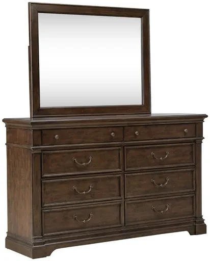 In a world of fleeting trends, the Arden Road dresser and mirror stands as a beacon of enduring elegance. Crafted with excellence using poplar solids and rustic alder veneers, this set features a satin cherry finish. The dresser showcases column pilasters that flow into block feet.