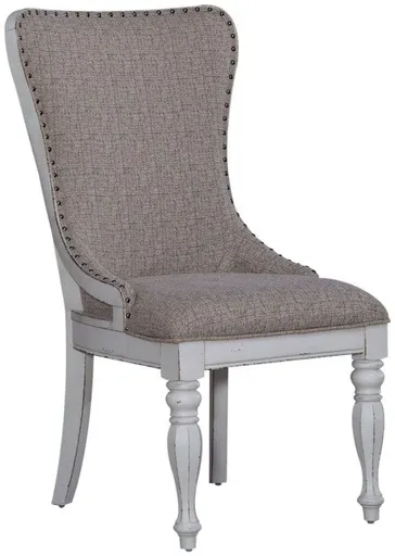 Sit in comfort and style with the Magnolia Manor upholstered wing back side chair. Crafted with excellence using rubberwood solids, this chair features a heavily distressed antique white base with ivory tweed chenille upholstery. The chair has an alluring flared cap rail and gently sloping arms for a classic timeless design.
