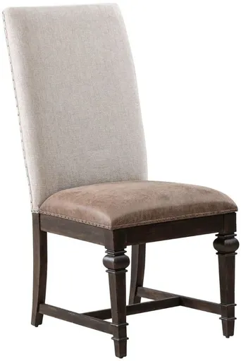Forget dining out and make your home the best place to enjoy a meal with the Paradise Valley upholstered side chair. This piece features a saddle brown finish. Delight the eye with the two-tone fabric of the exposed wood upholstered side chair featuring a flax tweed upholstered back and a tobacco leather like fabric seat.