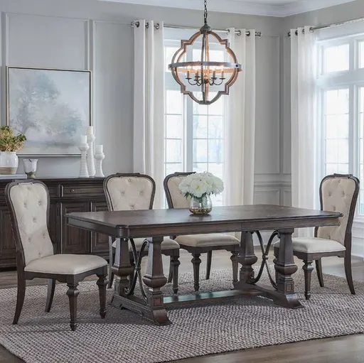 In a world of constant change, the Provence Park Collection remains a testament to the enduring power of classic design. Its warm antique finishes, artistic distressing, and grand scale evoke a sense of history, creating a bridge between eras. Includes trestle table and 4 upholstered side chairs. One 20 inches self storing leaf. Easy glide leaf track system. Fancy face veneer top. Concaved corners. Scrolled x-shaped poly resin accent. Resin accent painted to look like metal. Cream textured chenille upholstery.