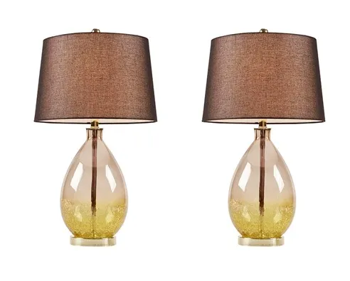 Update your space with the sleek style of the Cortina Table Lamp Set of 2. The metal and gold glass base gives the lamp a striking sleek look. The black, tapered drum shaped shade softly filters the light, while also beautifully complementing the look. This table lamp is easy to incorporate into your existing space and perfect for accenting any living room or bedroom. One Type A light bulb is needed. Comes with a 2-year warranty.