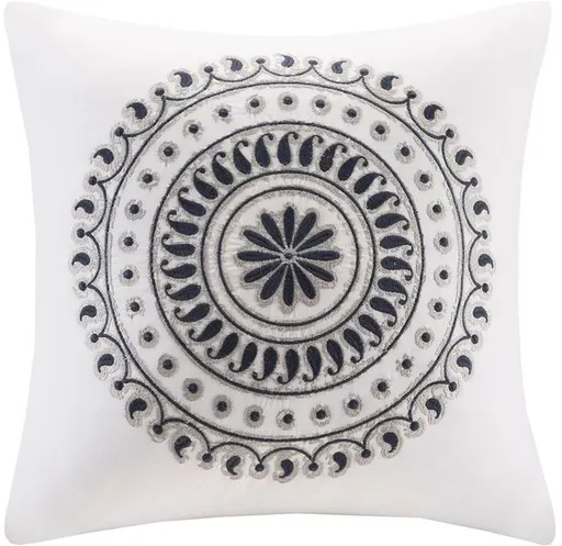Perfect as a decorative pillow on your bedding or an accessory for your couch, the INK+IVY Fleur Square Pillow is versatile in any space. Its off white backdrop showcases an intricate medallion motif embroidered with navy thread for a pop of color. Decorative for your couch or bedding. Square shape. 200 thread count. Materials: 200 thread count cotton, embroidered, 400gsm polyester filling, hidden zipper Country of Origin: China