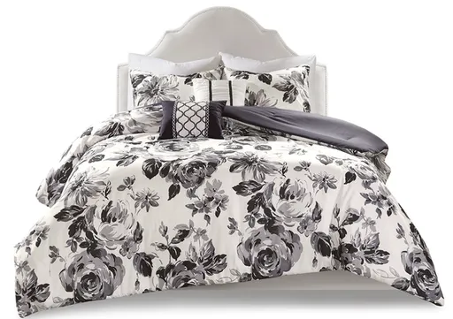 100% polyester 5-pcs printed comforter set. Ultra soft comforter set in printed black and white all over floral. Set includes comforter, 2 matching shams (1 in Twin/TwinXL), 1 square and 1 oblong pillow. Antimicrobial treatment helps reduce the growth of odor causing bacteria and keeps fabric lasting longer. Hypoallergenic polyester filling in comforter and decorative pillows. Machine washable for easy care. Size: Full/Queen Style: Transitional