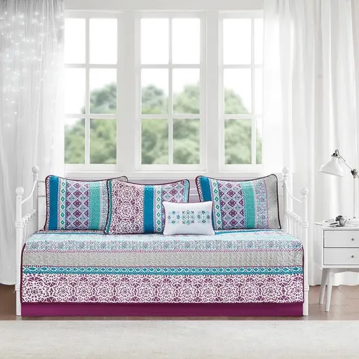 Update your guest bedroom with the chic boho flair of the Intelligent Design Joni 6 Piece Boho Reversible Daybed Set. Featuring several globally inspired prints, this daybed flaunts bold and bright colors with a solid purple reverse to create a gorgeous boho look.