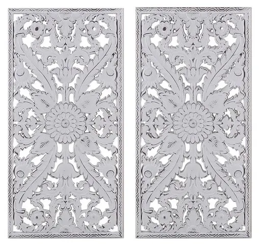 Complete your home decor with our Madison Park Botanical Panel Carved Wall 2 Piece Set. This wall decor set features exquisite carved global botanical designs in a durable MDF material creating beautiful texture and dimension, while a white washed finish adds a unique vintage touch. Each piece is finished with two D-rings on the reverse making it easy to hang pieces, either side by side for a more clean look or staggered for a more stylized approach. Perfect for any living room, dining room, or entry way - this carved wood panel 2 piece set is the perfect elegant touch to any decor.