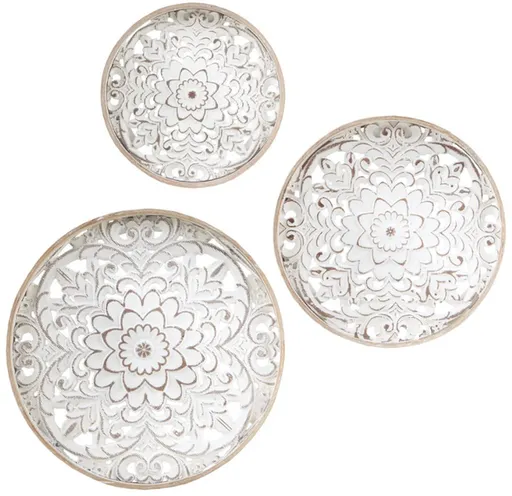 Update any room in your home with our Madison Park Medallion Trio Wood Wall Decor 3 Piece Set. Each round piece features a 100% fir wood frame with an intricate white wood medallion design in the center, for vintage and globally inspired look. A Sawtooth hanging fixture on the back makes each wall art piece easy to hang. With so many options - arrange this 3 piece wall decor set any way you desire to suit any small size space and add that perfect charming touch!