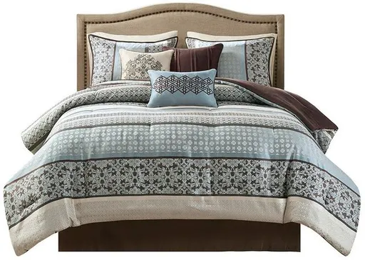 Update your bedroom with the Princeton comforter set. Princeton creates character with intricate geometric and damask prints in a mix of grey, ivory, and soft blue tones. This comforter set includes two standard shams and three embroidered decorative pillows in blue, ivory, and brown with embroidery and pieced details that pull the whole look together. Made from polyester jacquard and a brushed fabric reverse this comforter is soft to the touch and is machine washable for easy care.
