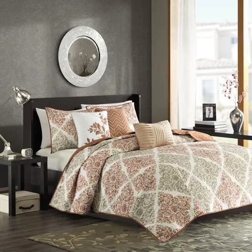 Spruce up your space with the Madison Park Claire 6 Piece Reversible Coverlet Set. This unique pattern has a small leaf print inside each diamond that makes up this crisscross design. Pops of burnt orange give the perfect amount of color to add this collection into your neutral space. Three decorative pillows use embroidery and fabric manipulation for the perfect finishing touches to this collection.