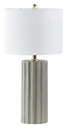 The Martha Stewart Glendale ceramic ribbed 27" table lamp blends classic and contemporary styles to update your home decor. This ceramic table lamp showcases a ribbed fluted modern design with a Grey finish, for a refined modern look. The white linen drum shade softly filters light to perfectly illuminate your space and is not adjustable. This table lamp also has a rotary on-off switch and brings a chic and subtle style to your living room or bedroom. 1 Type-a light bulb is needed. Spot clean only. Comes with a 2-year warranty.